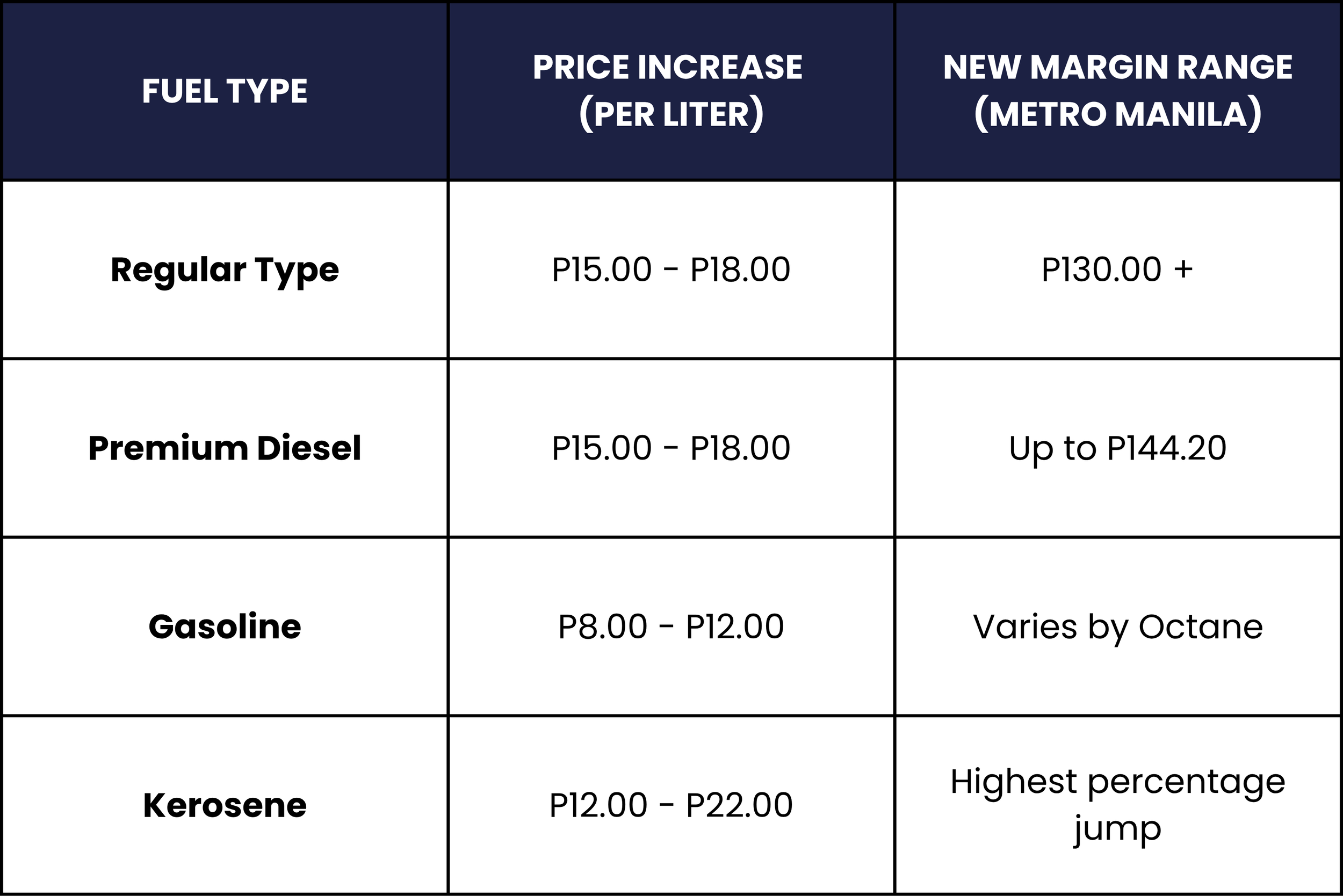 Gasoline: Increased by P8 to P12 per liter.