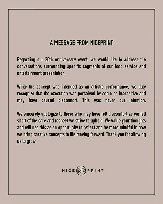 "As a catering team, we take full responsibility for how our service is experienced... We appreciate the feedback and will be more mindful in how we execute future experiences," the firm posted on its official page.