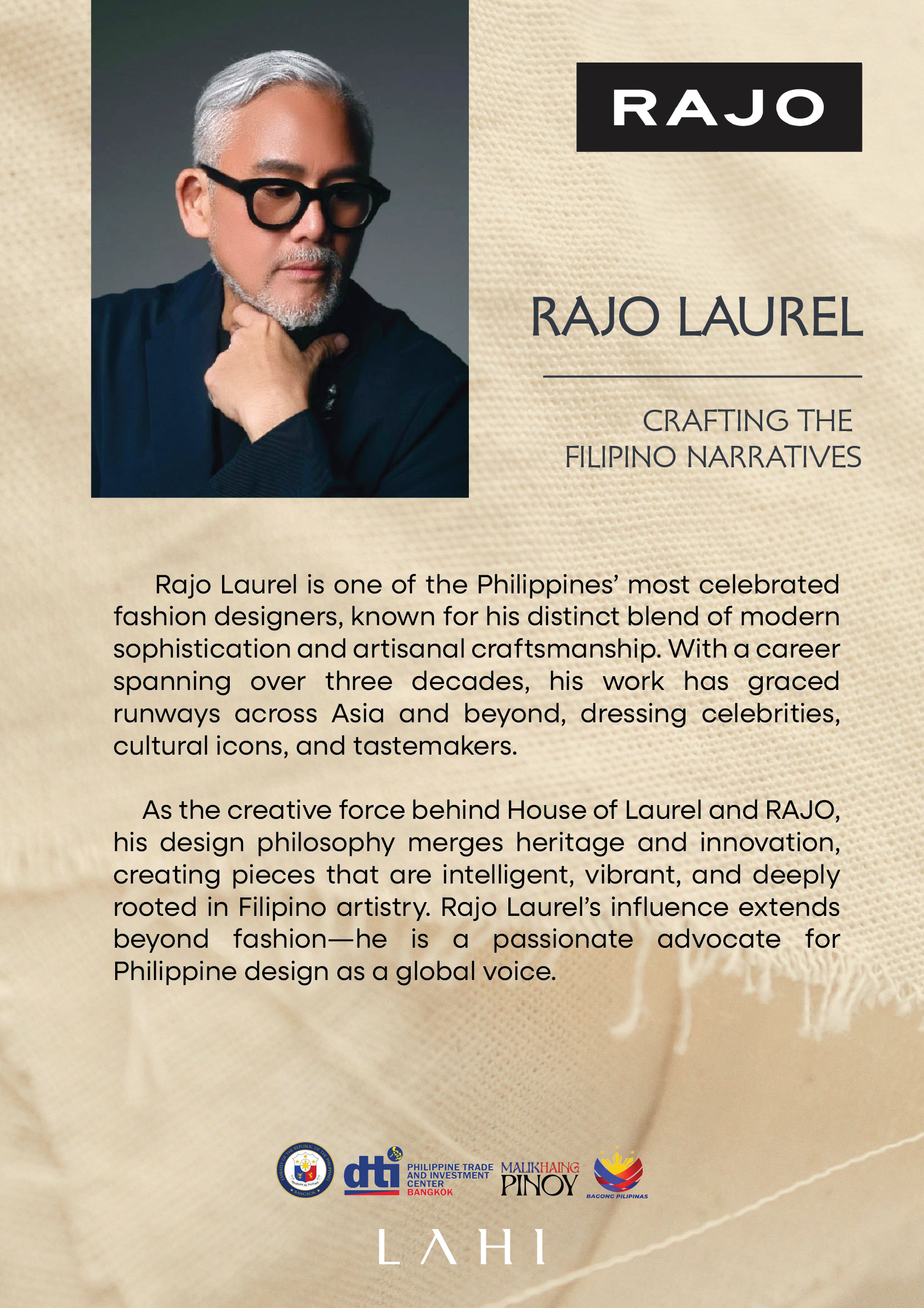 “’Who is the Filipino?’ This is the question I explore in this collection, Lahi,” reflects Rajo Laurel. “Fashion has been my medium to understand heritage, identity, and culture—not only through materials, but through how our people interact, the values that guide us, and how these stories can remain relevant for today and for future generations.” He adds, “Being Filipino can mean many things. There is no single definition of our culture. With Lahi, my perspective bridges who we are and who we can become. Understanding our roots empowers the future.”